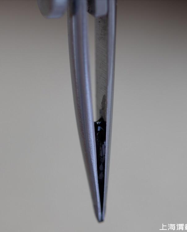 比較簡單的方法是拿小刀片調(diào)整中縫的開縫大小,和筆尖與筆舌間的距離,使更多的墨水能夠到達(dá)銥粒這邊,靠重力也能克服最后內(nèi)凹的這點(diǎn)距離。這一步驟俗稱“刀尖”。只要不刮花金屬鍍層,基本上整個(gè)過程還是可逆的,就算一次下來效果不滿意也有進(jìn)一步調(diào)整的余地。比如刀得太寬了,還能捏一捏再讓他緊一點(diǎn)。注意這里我們并不是要把中縫一味地開大,而是調(diào)整到合適的寬度,因?yàn)樘珜捘€是會(huì)留在中縫里,太窄又無法順利地從筆舌那邊引過來。