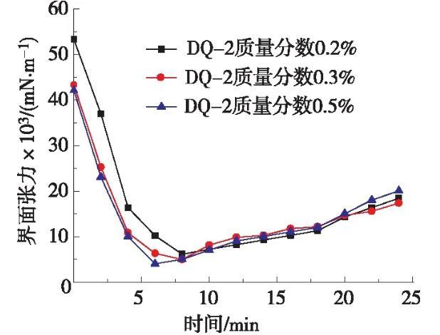 將一定質(zhì)量濃度的低界面張力表面活性劑DQ-2體系溶液與巖心按照質(zhì)量比為1∶6的比例混合,在油藏溫度(80℃)條件下靜置5 d,每天分別測定低界面張力表面活性劑DQ-2體系與原油的油水界面張力。