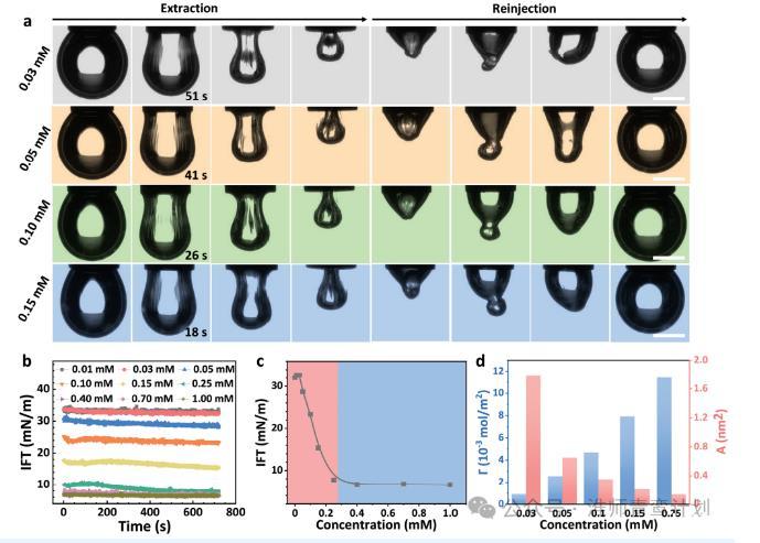 首先,在GL和SSD共組裝之前,用垂滴張力法研究了GL在水-甲苯中的界面行為。如圖1a所示,當(dāng)提取濃度為0.03、0.05、0.10和0.15 mM的甲苯中GL水溶液的液滴時,分別在51、41、26和18 s時,液滴界面面積減小,在液滴界面上出現(xiàn)了明顯的起皺。同樣,當(dāng)液滴完全虹吸到針管中并重新注入到初始體積時,起皺現(xiàn)象重新出現(xiàn),液滴由不規(guī)則逐漸擴大到規(guī)則。抽注過程中起皺現(xiàn)象的出現(xiàn),有力地揭示了水-甲苯界面處彈性膜的形成。圖1b測量了GL溶液和甲苯之間的時間分辨界面張力(IFT)。當(dāng)GL濃度<0.03 mM時,甲苯與GL溶液之間的界面張力近似等于純水與甲苯之間的界面張力(≈32 mN·m?1)。隨著GL溶液濃度從0.03增加到0.25 mN·m?1,界面張力下降到6.8 mN·m?1,而從0.25到1.00 mM,界面張力保持在6.8 mN·m?1不變當(dāng)GL濃度<0.03 mM時,甲苯與GL溶液之間的界面張力近似等于純水與甲苯之間的界面張力(≈32 mN·m?1)。隨著GL溶液濃度從0.03增加到0.25 mM,界面張力下降到6.8 mN·m?1,而從0.25到1.00 mM,界面張力保持在6.8 mN·m?1不變。據(jù)此,確定0.25 mM為GL分子在水-甲苯界面處的臨界膠束濃度(CMC)(圖1c)。這意味著液滴在GL的CMC以下會發(fā)生收縮,而在CMC以上液滴會發(fā)生起皺。為了進一步解釋這一現(xiàn)象,我們計算了不同濃度下GL分子的界面吸附容量和截面積。圖1d我們可以看到GL的界面吸附量隨濃度的增加成比例增加,相反,隨著濃度的增加,橫截面積減小。綜上所述,GL是一種特殊的兩親分子,可以在油水界面形成界面膜。