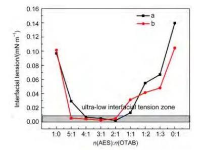 AES/烷基季銨鹽CTAB摩爾比為1:1的混合體系的β參數(shù)計算結(jié)果為~20.4,表明AES與烷基季銨鹽CTAB親水基間具有極強的吸引作用。值得注意的是,該體系還具有很高的溫度穩(wěn)定性,在55°C時仍能保持30 mN·m-1以下的表面張力。這說明在較高溫度時該體系的分子排列仍然較為緊密,這和陰陽離子表面活性劑體系中分子因靜電吸引造成的緊密排列是密切相關(guān)的??紤]到油水界面張力同樣與界面上的分子排列有關(guān),因此有可能在溫度較高時實現(xiàn)超低界面張力。