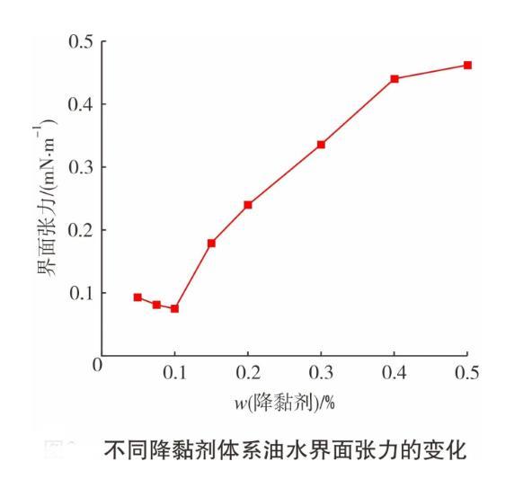 圖1為在不同降黏劑質量分數(shù)下,體系油水界面張力的變化情況。從圖1可知,在降黏劑質量分數(shù)為0.05%~0.10%時,界面張力隨質量分數(shù)增加而降低。當降黏劑質量分數(shù)超過0.10%時,界面張力開始上升。在低質量分數(shù)下,降黏劑在油水界面上形成吸附膜,降低界面張力。當降黏劑質量分數(shù)超過臨界膠束含量后,降黏劑在界面聚集數(shù)量增加,吸附層排布更不規(guī)則,導致界面張力升高。