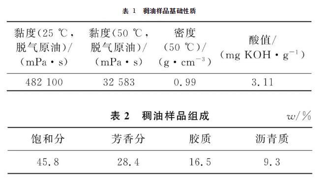 實驗所用材料:凍膠分散體,實驗室自制[18];稠油冷采降黏劑,上海諾頌實業(yè)有限公司;實驗用模擬地層水礦化度8 000 mg/L(NaCl與CaCl2質量比為9∶1);所用稠油樣品為勝利油田河口采油廠的特超稠油,油藏溫度為50℃,樣品基礎性質及組成見表1和表2。