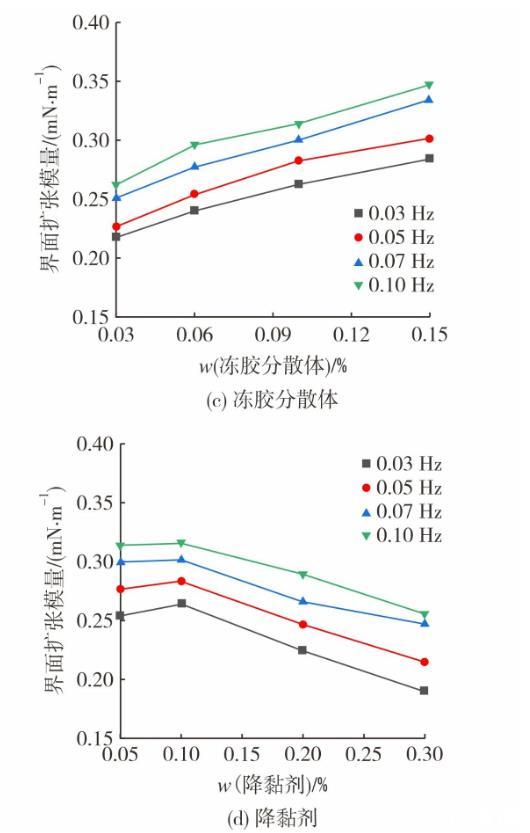 圖2為體系組成對動態(tài)界面張力及界面擴張模量的影響。圖2(a)和圖2(c)呈現(xiàn)了凍膠分散體質量分數(shù)對界面流變性質的影響。其中,降黏劑質量分數(shù)保持為0.10%。隨著振蕩時間的增加,體系界面張力逐漸趨于穩(wěn)定。凍膠分散體在高質量分數(shù)時,穩(wěn)定界面張力明顯更高,這是由于在降黏劑質量分數(shù)不變時,油水界面上降黏劑分子數(shù)量相對固定凍膠分散體在油水界面的吸附量隨質量分數(shù)增大逐漸增加,擠占了降黏劑分子在界面吸附位置。同時,由于體系黏度上升,降低了降黏劑向界面擴散的速度,導致界面張力增加。體系黏度提高,增加了動態(tài)擴張模量,在高質量分數(shù)凍膠分散體條件下,黏彈性提升效更加顯著。