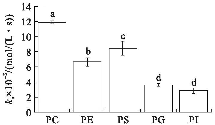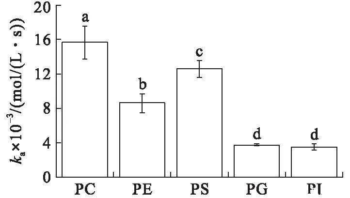 在初始表面壓力為25 mN/m的條件下(見圖4),VhPLD對PC的吸附常數(shù)最大((1.46±0.10)×104mol/(L·s)),對于PG((3.58±0.31)×103mol/(L·s))和PI((4.30±0.34)×103mol/(L·s))的吸附常數(shù)最小。在該初始表面壓力條件下,VhPLD對于PC、PE和PS的解離常數(shù)之間不存在顯著差異(P>0.05),該結(jié)果與在15 mN/m所測定的結(jié)果保持一致。而在該條件下獲得的VhPLD對不同磷脂單分子層吸附偏好性順序?yàn)镻C>PS>PI>PE=PG。