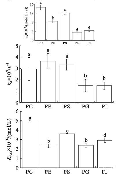 圖2初始表面壓力15 mN/m的條件下VhPLD對PC、PE、PS、PG和PI的吸附動力學(xué)參數(shù)