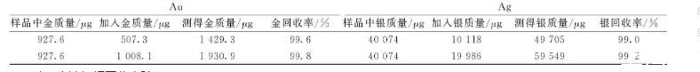 稱取兩份2.0 g(精確至0.000 1 g,金含量463.8 g/t,銀含量20 037 g/t)粗鉍樣品,分別加500、1 000μg金和10 000、20 000μg銀,按照實(shí)驗(yàn)方法氧化、除鉍、火法富集,進(jìn)行分析,測(cè)得金銀含量和加標(biāo)回收率見(jiàn)表6。