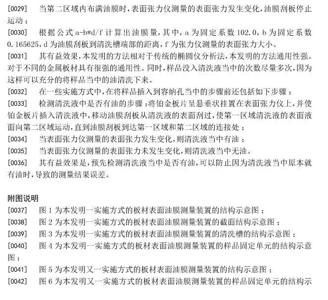 [0014]同時(shí)由于樣品固定單元是位于第一區(qū)域上方的,所以當(dāng)油清洗下來的時(shí)候,首先是在第一區(qū)域的清洗液面擴(kuò)散開來形成油膜。當(dāng)油膜刮板從第一區(qū)域的一端向著第二區(qū)域方向運(yùn)動的時(shí)候,油膜就會向第一區(qū)域運(yùn)動,當(dāng)?shù)谝粎^(qū)域內(nèi)聚滿油膜的時(shí)候,表面張力儀就會通過鉑金板片感應(yīng)到清洗液表面張力的變化,此時(shí)油油膜刮板停止運(yùn)動,計(jì)算出整個(gè)油膜的面積。為了方便計(jì)算油膜的面積,可以在清洗槽的邊沿上設(shè)置相應(yīng)的刻度,同時(shí)將油膜刮板設(shè)置成與清洗槽的邊沿相垂直。最后根據(jù)公式a-b*d/f計(jì)算出油膜量,其中,a為固定系數(shù)102.0,b為固定系數(shù)0.165625,d為油膜刮板到清洗槽端部的距離,f為張力儀測量的表面張力大小。