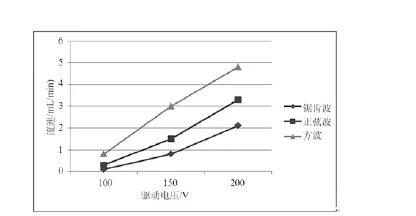 (1)探討壓電陶瓷片在不同波形驅(qū)動(dòng)下,微泵流速的比較,為驅(qū)動(dòng)電壓波形的選擇提供依據(jù);