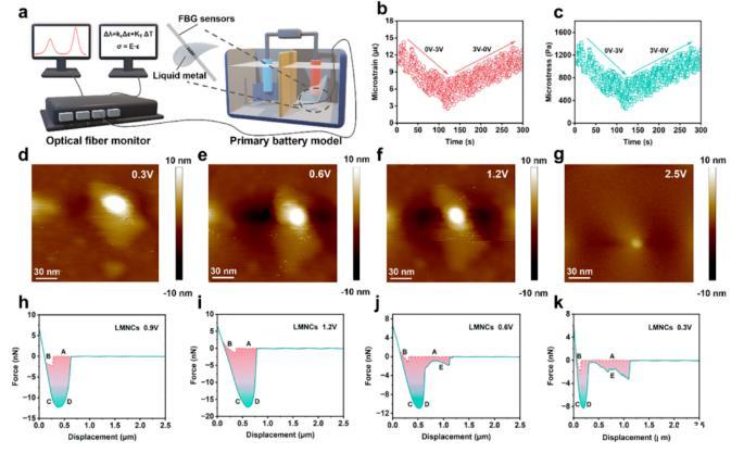 圖2電極材料的應(yīng)力-電化學(xué)測試。(a)光纖布拉格光柵傳感器(FBG)在液態(tài)金屬中的應(yīng)力-電化學(xué)測試示意圖。(b,c)FBG在液態(tài)金屬中的應(yīng)力響應(yīng)圖。(d-g)不同電壓下軟包電池中LMNCs的AFM測試圖。(h-k)不同電壓下的LMNCs力-位移曲線圖。