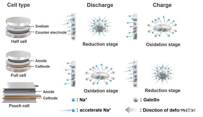 該工作闡述了液態(tài)金屬界面張力與電極電勢之間的關(guān)系,并闡明了電極電勢對Na+電化學(xué)傳輸速率的影響(圖1)。在還原反應(yīng)過程中,電極電勢降低,液態(tài)金屬的界面張力加快了Na+向內(nèi)的傳輸速率。在氧化反應(yīng)過程中,電極電勢增加,液態(tài)金屬表面電荷密度增大,界面張力下降,加快了Na+向外的傳輸速率。在此基礎(chǔ)上,為了加強液態(tài)金屬結(jié)構(gòu)穩(wěn)定性,構(gòu)筑液態(tài)金屬核殼包覆結(jié)構(gòu)(LMNCs),其自調(diào)節(jié)的界面張力有效改善了Na+傳輸動力學(xué)過程。