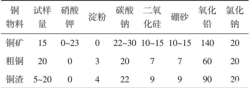 配料前可根據(jù)待測(cè)物組分確定熔渣的硅酸度,然后計(jì)算各熔劑的需要量。同時(shí)根據(jù)試樣還原力試驗(yàn)結(jié)果(或理論計(jì)算試樣的還原力)調(diào)整氧化劑或還原劑加入量。通過優(yōu)選實(shí)驗(yàn),推薦含銅物料的配料可按表1進(jìn)行。