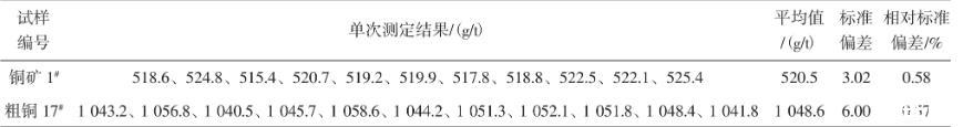 稱取20.00 g樣品,銅礦、銅渣樣直接干法試金配料,按試驗(yàn)方法進(jìn)行分析,結(jié)果見表4和表5。
