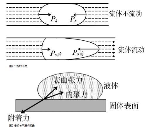 如圖4所示,當(dāng)流管中流體不流動(dòng)時(shí),流體中的氣泡呈橢球狀,兩邊對(duì)稱.但當(dāng)流體流動(dòng)時(shí)會(huì)造成氣泡的變形,沿流體前進(jìn)方向,氣泡前端被“拉伸”而變尖,曲率半徑變??;而后方被“推壓”而變凸,曲率半徑變大.由(2)式可知,前端的附件壓強(qiáng)PS前要比后端的附加壓強(qiáng)PS后大,從而造成流體流動(dòng)受阻.當(dāng)氣泡較多時(shí)阻力隨著增大,就造成了氣栓。