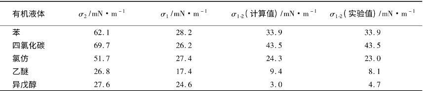 表1給出了幾種有機(jī)液體(油)與水接觸時(shí)的界面張力理論計(jì)算值和實(shí)驗(yàn)測量值的比較。