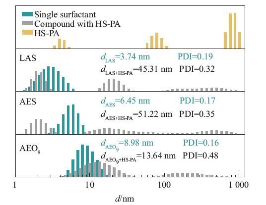 為了探究高分子表面活性劑在水溶液中聚集行為,考察了常規(guī)表面活性劑與HS-PA復配前后的膠束粒徑變化。由圖3的結(jié)果可知,3種低分子量表面活性劑的聚集體尺寸及分布情況比較相似,其粒徑均小于10 nm,呈現(xiàn)出單峰分布。LAS、AES和AEO9的平均膠束粒徑分別為3.74,6.45和8.98 nm。PDI越大,說明其粒徑分布越寬,高分子表面活性劑HS-PA的PDI大于0.5,其粒徑情況不適合用平均粒徑值表示,因此未在圖中提供平均粒徑的數(shù)據(jù)。從圖3中HS-PA的粒徑分布情況可以看出,其聚集體為多峰分布,且分布較寬。粒徑為3~5 nm的聚集體可能是HS-PA的單分子膠束。與低分子量表面活性劑不同,在稀溶液中,高分子表面活性劑結(jié)構(gòu)中的疏水鏈段傾向于聚集,分子卷縮,可自身形成單分子膠束,該現(xiàn)象曾被許多研究報道。粒徑為50~110 nm以及650~1 000 nm的為HS-PA的有序多分子聚集體,如膠束、小囊泡等。HS-PA分子量大,分子中的疏水鏈段和親水鏈段長,導致其有序多分子聚集體的粒徑明顯比低分子量表面活性劑大。