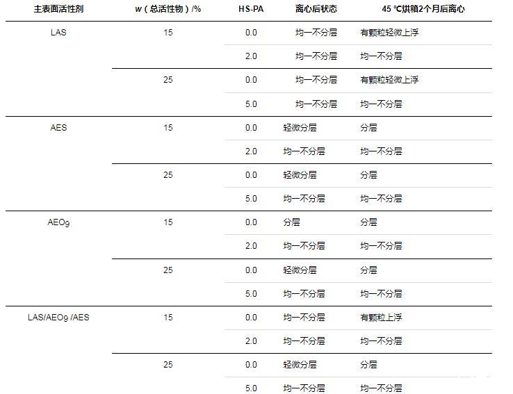 考察了一種重均分子量為4 244,表面張力為42.06 mN/m的聚醚-聚丙烯酸/酯高分子表面活性劑HS-PA在非結(jié)構(gòu)型洗滌劑和結(jié)構(gòu)型洗滌劑中的應用性能。經(jīng)激光粒度儀測定,與單一的低分子量表面活性劑膠束相比,當HS-PA分別和LAS/AES/AEO9形成混合膠束時,聚集體的平均粒徑將增大。HS-PA在非結(jié)構(gòu)型/結(jié)構(gòu)型洗滌劑中的應用性結(jié)論如下: