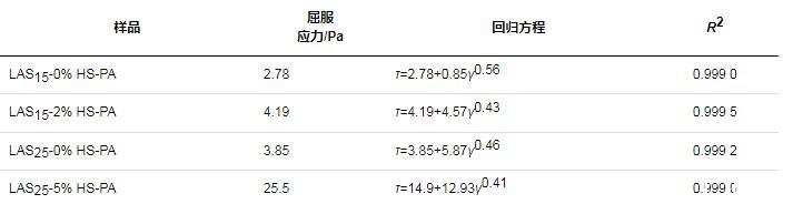 根據(jù)Herschel-Bulkley模型擬合的回歸方程及流變參數(shù)如表5所示(命名規(guī)則:主表面活性劑總活性物質(zhì)量分數(shù)-HS-PA用量),其中擬合曲線相關(guān)系數(shù)(R2)均不小于0.999,相關(guān)性較高,表明LAS體系的流變性可以利用Herschel-Bulkley模型進行研究。在活性物質(zhì)量分數(shù)為15%的體系中添加2%HS-PA,屈服應力從原先的2.78 Pa提高至4.19 Pa,在25%活性物配方中加入5%HS-PA,屈服應力由3.85 Pa提高至25.5 Pa,說明HS-PA的添加可以提高體系的屈服應力。屈服應力是指液晶結(jié)構(gòu)破壞時的臨界剪切應力值。由前文研究結(jié)果可知,HS-PA的加入使配方獲得更多更致密的球形層狀液晶,因此,相應地,體系屈服應力也越大。而屈服應力越大,當體系中包含水不溶粒子(如微膠囊)時越容易穩(wěn)定,該結(jié)果與離心測試結(jié)果相契合。