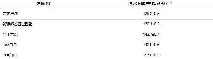 以不同極性的油脂為油相制備了一系列的Pickering乳液,圖2是不同油脂得到的W/O型Pickering乳液的表觀照片、微觀圖像及粒徑分布圖,可以看出,不同油脂得到的Pickering乳液粒徑具有較大的差異,粒徑大小順序?yàn)榛艋舭陀停?.45μm)<鯨蠟醇乙基己酸酯(8.66μm)<異十六烷(17.46μm)<15#白油(18.20μm)<26#白油(24.53μm),極性油脂制備的Pickering乳液的粒徑較小,且極性越大,Pickering乳液的粒徑越小,而非極性油脂制備出的乳液的粒徑較大,這是由于油相的極性會(huì)影響油-水-固體三相接觸角(見表1),油相的極性越大,油-水-固體三相接觸角越接近于90°,乳液的粒徑越小。
