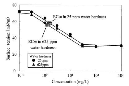 在 AS 的情況下(圖 9),界面活性增加, cmc 降低,毒性值向左移動(dòng)(即 濃度降低),同時(shí)水硬度增加。 另一方面,AE8的表面張力曲線 幾乎不受水硬度的影響(圖 10)。 gtox 值 AS 和 AE8 的值恒定在 65-70 mN/m 和 對(duì)于任何水硬度,分別為 55-60 mN/m。 如上所述,陰離子表面活性劑的毒性受到影響 通過水的硬度。 然而,在大多數(shù)情況下,gtox 值 對(duì)每種表面活性劑來說都是恒定的。