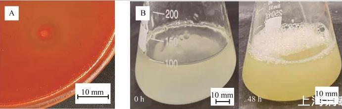圖2菌株O5的剛果紅染色(A)及降解瓜爾膠特性(B)