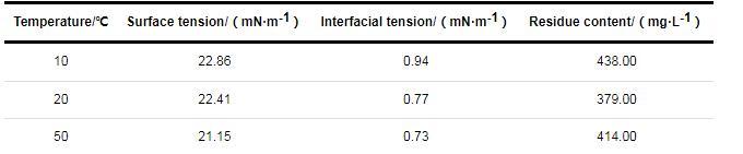 在水力壓裂過程中,僅壓裂返排液的粘度低不能說明裂縫中的壓裂液已返排干凈,要綜合考慮其破膠性能。壓裂液在10、20和50℃條件下破膠3 h后,破膠液的表面張力、界面張力和殘渣量的測定結(jié)果如表3所示。由表中數(shù)據(jù)可知,無論是在10、20還是50℃條件下,破膠液的表面張力均小于28 mN/m,界面張力均小于2 mN/m,殘渣量均小于600 mg/L,達到或優(yōu)于我國石油天然氣行業(yè)標準SY/T 6376-2008《壓裂液通用技術條件》的要求,SY/T 6376-2008中關于破膠性能的各項指標分別為:破膠時間≤720 min,破膠液表觀粘度≤5.0 mPa·s,破膠液表面張力≤28.0 mN/m,破膠液與煤油界面張力≤2.0 mN/m,殘渣量≤600 mg/L。這充分說明ME-O5在低溫下的破膠效果良好,在低溫油田壓裂破膠方面表現(xiàn)出巨大的應用潛力。