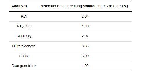 水基壓裂液是由多種不同的添加劑按比例配成的非均質(zhì)不穩(wěn)定化學體系。隨著壓裂技術的不斷發(fā)展,壓裂液體系也在不斷優(yōu)化。在實際的壓裂施工中,水基壓裂液的配方由于施工環(huán)境的不同,存在著較大的差異。本壓裂液配方選擇油田中常用的瓜爾膠作為稠化劑;選擇硼砂作為交聯(lián)劑;為了穩(wěn)定粘土礦物,選擇KCl作為粘土穩(wěn)定劑,以減少粘土礦物等對儲層滲透率造成的傷害;為了使壓裂液的性能更加穩(wěn)定,便于控制,還加入了一定量的Na2CO3和NaHCO3,作為pH調(diào)節(jié)劑。此外,從低成本的角度考慮,選擇戊二醛為殺菌劑,用來防止細菌滋生。