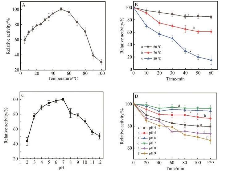 圖5溫度、pH值對β-甘露聚糖酶酶活力及穩(wěn)定性的影響
