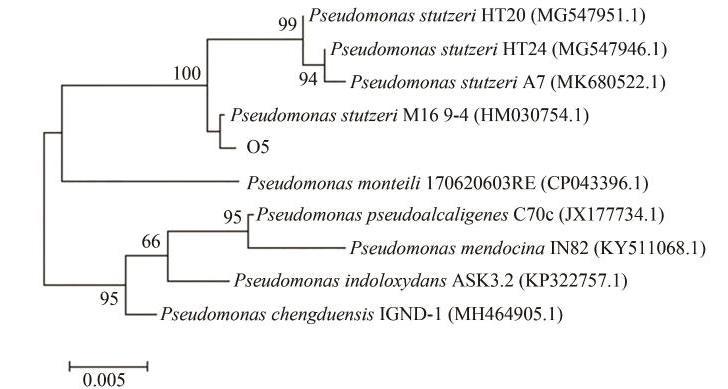利用16S rRNA基因測序?qū)闛5進行鑒定,將測序結(jié)果通過NCBI數(shù)據(jù)庫中的BLAST進行比對分析,發(fā)現(xiàn)菌株O5與假單胞菌的同源性最高,為99.87%。利用MEGA軟件構(gòu)建系統(tǒng)發(fā)育樹(圖4)。由圖4可知,菌株O5和施氏假單胞菌Pseudomonas stutzeri M16-9-4位于進化樹的同一分支中,親緣關系最相近。綜合形態(tài)特征鑒定,鑒定菌株O5為施氏假單胞菌(Pseudomonas stutzeri),命名為Pseudomonas stutzeri O5。