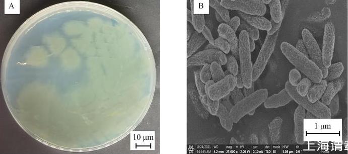 形態(tài)學鑒定如圖3所示,菌株O5在LB平板上呈灰綠色,表面光滑隆起,邊緣不整齊;革蘭氏染色鑒定為陰性;經(jīng)掃描電子顯微鏡觀察得,菌株O5為桿狀菌,菌體長為1.5~2.0μm,寬為0.3~0.4μm。