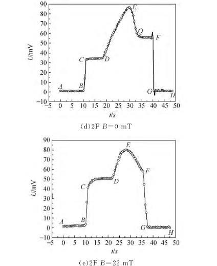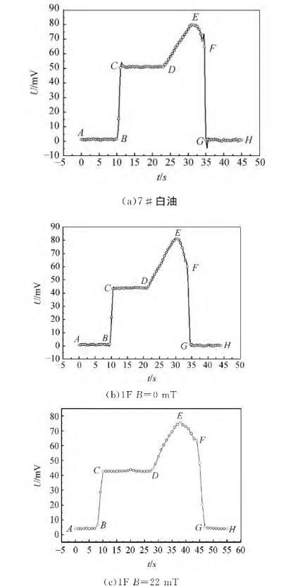 使用拉脫法測量了磁性液體的磁表面張力,無外加磁場作用時(shí),磁性液體的表面張力小于其載液的表面張力,磁性液體液膜拉得更長,液膜收縮的趨勢比白油更明顯,這主要是因?yàn)榇判砸后w中加入的表面活性劑降低了其表面張力。由液膜拉脫過程電壓變化曲線可觀察到:不同條件下磁性液體的電壓變化情況不同,無外加磁場作用時(shí)2F號磁性液體在EF階段存在轉(zhuǎn)折點(diǎn)Q,越過轉(zhuǎn)折點(diǎn),QF階段電壓變化較平緩,且表面張力越??;而7#白油和1F磁性液體并未出現(xiàn)此現(xiàn)象,這主要是因?yàn)?#白油和1F磁性液體表面張力較大,2F號磁性液體由于表面張力較小,其液體分子與分子之間的作用力較弱,宏觀表現(xiàn)為拉脫的液膜更長,液膜在空氣中會存在一段時(shí)間。有外加磁場作用時(shí),2F號磁性液體在FG階段并未出現(xiàn)電壓變化平緩的中間過程,但FG階段出現(xiàn)了另一些數(shù)據(jù)點(diǎn),液膜破裂的時(shí)間大于無外加磁場作用時(shí)的時(shí)間,主要是由于外加磁場增強(qiáng)了磁性顆粒之間的相互作用,分子和分子之間的磁吸引力增強(qiáng),導(dǎo)致液膜逐步破裂。