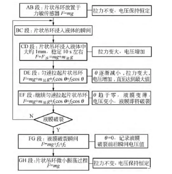 根據(jù)受力情況將圖4的液膜拉脫過程電壓變化曲線分為6個(gè)階段,圖5為液膜拉脫過程方框圖,不同階段片狀吊環(huán)的受力情況不同,電壓變化值也不同,在液膜破裂前后瞬間,忽略液膜的重力,表面張力與重力方向完全一致,此時(shí)F=mg+f1+f2,可得到液體的表面張力。由圖4發(fā)現(xiàn),不同液體在EF階段的電壓變化情況不同,無外加磁場作用時(shí)2F號磁性液體在EF階段存在轉(zhuǎn)折點(diǎn)Q,越過轉(zhuǎn)折點(diǎn),QF階段電壓變化較平緩,且表面張力越小;而7#白油和1F磁性液體并未出現(xiàn)此現(xiàn)象。出現(xiàn)該現(xiàn)象的原因是7#白油和1F磁性液體表面張力較大,當(dāng)液膜被拉脫到一定程度時(shí),很快破裂;而2F號磁性液體由于表面張力較小,液體分子與分子之間的作用力減弱,宏觀表現(xiàn)為拉脫的液膜更長,液膜在空氣中會存在一段時(shí)間,此時(shí)液膜質(zhì)量很小,可忽略不計(jì),電壓變化較平緩。有外加磁場作用時(shí),1F和2F號磁性液體在FG階段并未出現(xiàn)電壓變化平緩的中間過程,但有外加磁場作用于磁性液體時(shí),F(xiàn)G階段出現(xiàn)了一些數(shù)據(jù)點(diǎn),液膜破裂的時(shí)間大于無外加磁場作用時(shí)的時(shí)間,主要是由于外加磁場增強(qiáng)了磁性顆粒之間的相互作用,分子和分子之間的磁吸引力增強(qiáng),導(dǎo)致液膜逐步破裂。