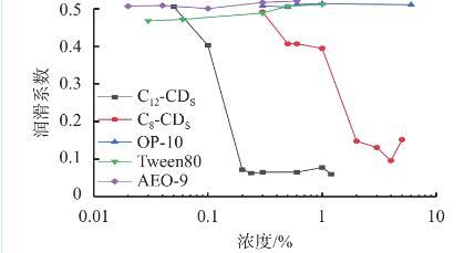 表面活性劑濃度是影響體系潤滑性能的重要原因之一。單一濃度無法全面系統(tǒng)地評價表面活性劑的潤滑性能,因此,進(jìn)一步探究表面活性劑濃度對潤滑性能的影響,測定了不同濃度的5種表面活性劑在硅酸鈉水溶液中的潤滑系數(shù),如圖1所示。