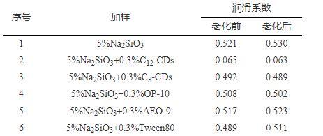 由表2可知,C12-CDs具有優(yōu)異的潤滑效果,可顯著改善硅酸鹽水溶液的潤滑性能,將潤滑系數(shù)從0.521降低至0.065,潤滑系數(shù)降低率高達(dá)87.52%,經(jīng)高溫老化后其潤滑系數(shù)進(jìn)一步降低,表明C12-CDs能夠耐高溫耐強(qiáng)堿,與硅酸鹽配伍性良好,而碳鏈相對較短的C8-CDs對硅酸鹽水溶液并沒有表現(xiàn)出明顯的潤滑效果。