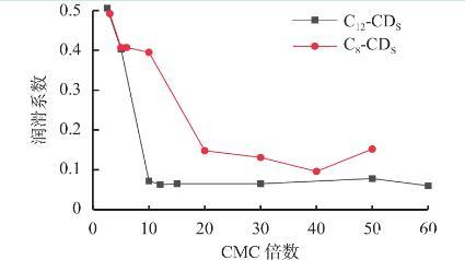 C12-CDS和C8-CDs的潤滑效果存在明顯差異,兩者疏水烷基鏈長度不同,而烷基鏈長度可影響表面活性劑的表界面活性以及膠束的形成,推測是CDs形成的膠束在潤滑過程中發(fā)揮作用,由此進(jìn)一步探究CDs的膠束對潤滑性能的影響,圖2是CDs的硅酸鈉溶液潤滑系數(shù)與2種CDS各自的CMC倍數(shù)的關(guān)系曲線。