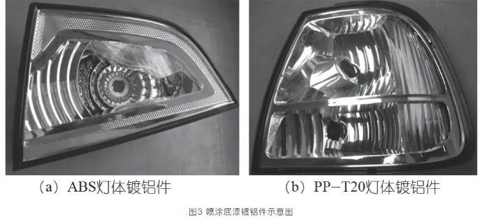 PP-T20和ABS表面張力都是較低,與鍍鋁層結合力較差,通過噴涂底漆獲得較好地表面張力,提高附著力。如圖3(a)所示為ABS材料加工汽車后霧燈體,ABS表面張力為34~38 mN/m,ABS是三元共聚物,內(nèi)在的成分比例有些差異,表面張力是個范圍值,可噴涂底漆(涂料低聚物環(huán)氧丙烯酸酯)改善ABS表面張力。
