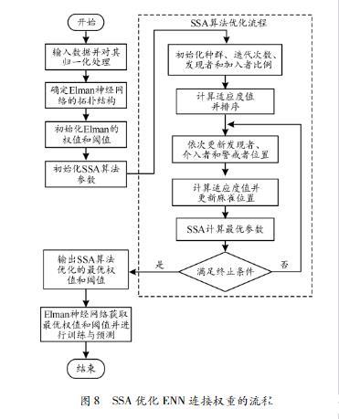 3.2.2SSASSA是模擬麻雀群體覓食和反捕食行為提出的群智能優(yōu)化算法。圖8展示了SSA優(yōu)化ENN連接權重的流程。