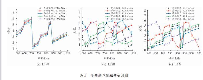 這是由于2個超聲波接收器所接收到的三相超聲波信號傳播所經(jīng)過的路徑和周期不同,導致對應的相角不同。L2和L3的相頻響應圖變化趨勢無相對明顯的變化規(guī)律,但超聲波信號在傳播過程中由于發(fā)生超聲弛豫、吸收、散射等現(xiàn)象導致相角的不同,其信息包含在相位頻譜中,對于分析變壓器油界面張力具有重要作用。