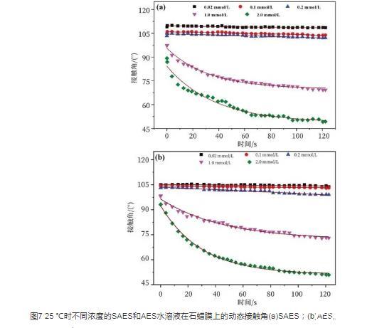 圖7 25℃時不同濃度的SAES和AES水溶液在石蠟?zāi)ど系膭討B(tài)接觸角(a)SAES;(b)AES。