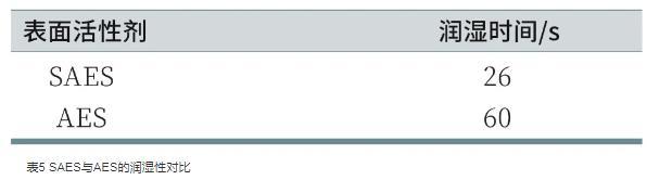 潤濕性是表面活性劑的基本應(yīng)用性能之一。帆布沉降法測定的是表面活性劑溶液對棉布的潤濕效果,潤濕過程的快慢取決于表面活性劑的性質(zhì)。由表5可知,SAES、AES對帆布片的潤濕時間分別為26 s和60 s,表明SAES的潤濕性優(yōu)于AES,這是由于SAES結(jié)構(gòu)中存在支鏈,表面活性劑分子從水溶液中遷移到氣-液界面的速率較快,容易擴(kuò)散到纖維表面,降低帆布片表面張力的能力較強(qiáng),從而具有較好的潤濕性。