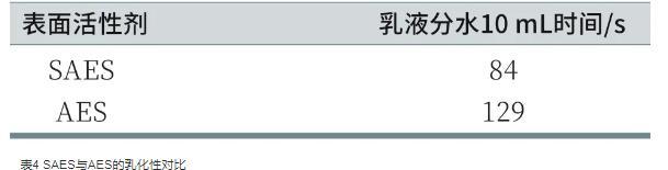 乳化作用是在一定的外力作用下使不混溶的兩種液體形成具有一定穩(wěn)定性的液液分散體系的作用,該分散體系被稱為乳狀液,是一種熱力學(xué)不穩(wěn)定體系。為了評估SAES和AES的乳化性,采用量筒法測定了二者對液體石蠟的乳化能力,記錄從乳液中分離出10 mL水所需要的時間,時間越長,乳化性能越好。SAES與AES的乳化性對比如表4所示。從表中可以看出,SAES的乳化性低于AES,這可能是因?yàn)镾AES分子中的支鏈結(jié)構(gòu),使得其分子總體積相對較大,在空間位阻以及電性斥力作用使疏水基難以插入油相中,即與液體石蠟之間的相互作用較弱,乳化性較差。