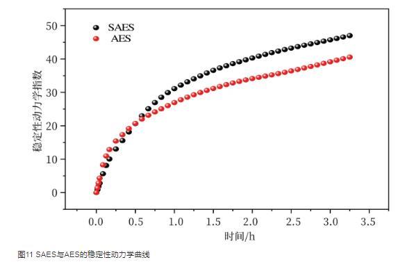 穩(wěn)定性動力學(xué)指數(shù)(di)反映的是樣品在整個放置時間濃度和顆粒粒徑的變化幅度的綜合值,穩(wěn)定性動力學(xué)指數(shù)越大,系統(tǒng)越不穩(wěn)定。圖11為SAES與AES的穩(wěn)定性動力學(xué)曲線,從圖中可以看出,在開始的0.5 h內(nèi),SAES與AES的穩(wěn)定性動力學(xué)指數(shù)幾乎相同,但隨著時間的增加,SAES的穩(wěn)定性動力學(xué)指數(shù)明顯高于AES,說明在開始的0.5 h內(nèi),二者的泡沫穩(wěn)定性幾乎相同,但是隨著時間的延長,SAES體系的穩(wěn)泡性明顯弱于AES,這是由于帶有一定支鏈的SAES分子在氣-液界面上形成的表面膜黏度低,不夠緊密結(jié)實(shí),泡沫穩(wěn)定性較差。