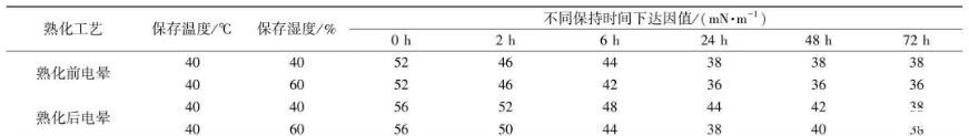 對(duì)比耐候?qū)邮旎半姇?、熟化后電暈在相同保存溫度、保存濕度環(huán)境下耐候?qū)舆_(dá)因值的變化規(guī)律,如表8所示。