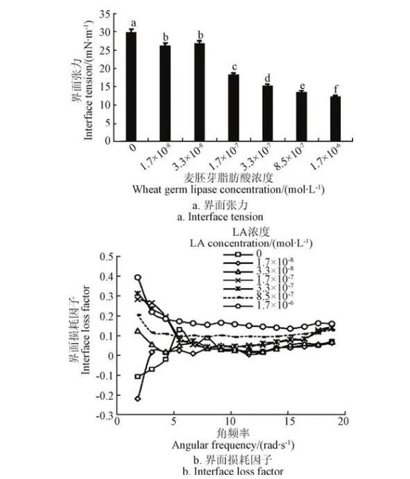 圖1b是不同濃度麥胚LA對油水界面損耗因子(tanδ)即損耗角正切值的影響。tanδ越大,耗散能量的能力越強(qiáng);由圖可見,tanδ隨麥胚LA濃度的增加而增加,當(dāng)麥胚LA濃度為1.70×10-6mol/L,tanδ值達(dá)到最大。該變化趨勢與界面張力變化趨勢有一定的相似性,原因可能是,麥胚LA濃度具有兩性特性,易富集在油水界面上。隨著其濃度的增加,導(dǎo)致界面黏度增加,進(jìn)而影響了因界面形變而耗散的能量。綜上,為了能夠觀察到明顯而準(zhǔn)確的試驗(yàn)結(jié)果,在后續(xù)研究中選取麥胚LA的濃度為1.70×10-6mol/L。
