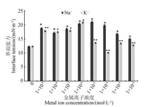 已有研究結(jié)果表明,電解質(zhì)的加入能使溶液內(nèi)部粒子之間的相互作用強(qiáng)于純水。因此,在一定濃度范圍內(nèi),電解質(zhì)的加入會使油/水溶液界面張力增大。本研究就Na+、K+離子對油水界面組成與結(jié)構(gòu)的影響進(jìn)行了驗(yàn)證研究。如圖2所示,Na+、K+對界面張力的影響相似,對麥胚LA界面張力的影響隨其濃度的增加呈現(xiàn)先增加后降低的趨勢,但高濃度時(shí)K+對油水界面張力的影響不及Na+顯著(P<0.05)。當(dāng)離子濃度在1.0×10-9~1.0×10-6mol/L時(shí),Na+、K+均可明顯提高界面張力。當(dāng)K+濃度高于1.0×10-5mol/L,麥胚LA的油水界面張力開始明顯降低。原因可能是高濃度無機(jī)鹽離子將影響麥胚LA在溶液界面上的聚集數(shù)量和穩(wěn)定性。由于麥胚LA具有類似于分子表面活性劑的性質(zhì),可以緊密吸附界面上,從而降低界面張力。