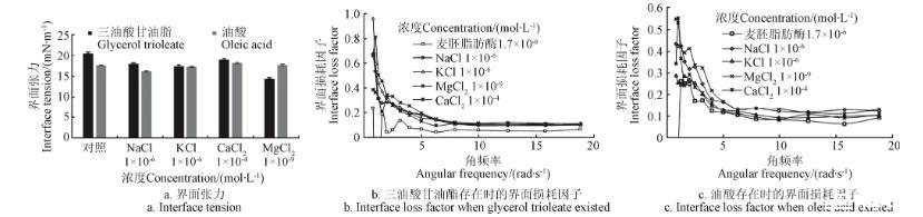 從圖8b和圖8c可以看出,三油酸甘油酯或油酸存在時(shí),無機(jī)鹽對tanδ的影響規(guī)律性較差,出現(xiàn)上述情況的原因可能是因?yàn)闊o機(jī)鹽離子降低了麥胚LA在油水界面的溶解度,從而為三油酸甘油酯或油酸保留了更多的界面面積,有利于更多的三油酸甘油酯或油酸占據(jù)有效界面,以至于降低了底物或產(chǎn)物存在時(shí)的油水界面張力。