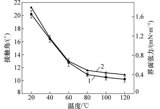 對20,40,60,80,100和120℃溫度下DBTL在CBT500光滑薄板上靜態(tài)接觸角進(jìn)行測量,結(jié)果如圖4所示。結(jié)合上述溫度下DBTL界面張力1(如圖3所示),將和1代入式(3),計算相應(yīng)溫度下DBTL與CBT500的接觸角法界面張力12,結(jié)果如圖4中界面張力所示。由圖4可知:隨著溫度升高,接觸角和接觸角法界面張力具有相同的下降規(guī)律,不同溫度區(qū)間內(nèi)下降趨勢不同,20~60℃溫度區(qū)間下降趨勢最大,60~80℃溫度區(qū)間下降趨勢次之,80~120℃溫度區(qū)間下降趨勢平緩。由Young方程可得cos=(2?12)/1,代入上述關(guān)系,即溫度升高,接觸角減?。怀送?,不同溫度區(qū)間內(nèi),DBTL對CBT500初期誘導(dǎo)率不同,從而導(dǎo)致不同溫度區(qū)間內(nèi)靜態(tài)接觸角、界面張力下降趨勢不一致。