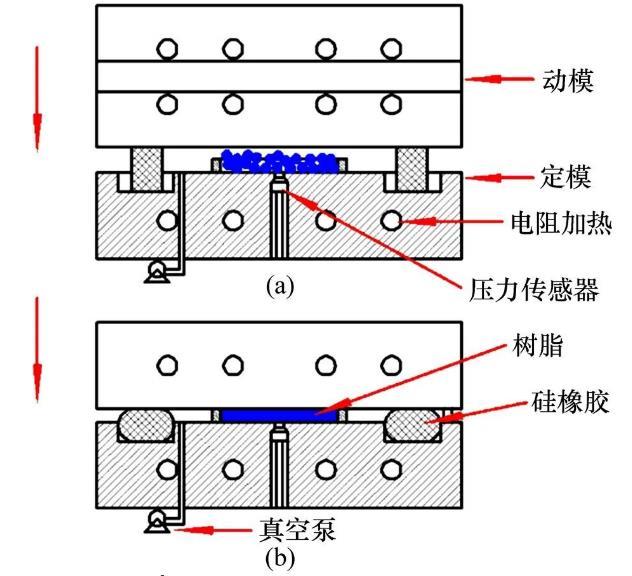 測定薄板分別由2種材料CBT500和PP制成,用于一定溫度下不同材料液滴在相應(yīng)薄板上靜態(tài)接觸角的測量。采用抽真空熱壓工藝制備光滑薄板,成型工藝參數(shù)如表1所示,具體過程為:采用信易SCD?20μ/30H干燥機(jī)對CBT500和PP顆粒進(jìn)行干燥,干燥溫度、時間分別為80℃和24 h。采用HH?138的精密烤箱對干燥后CBT500和PP顆粒分別進(jìn)行預(yù)加熱,加熱溫度分別為140℃和160℃,加熱時間均為0.5 h。將預(yù)加熱CBT500和PP顆粒分別倒入溫度為130℃和150℃的模具中,采取抽真空熱壓工藝制備CBT500和PP光滑薄板。抽真空熱壓工藝包括6個階段:1)動模降至密封圈;2)抽真空;3)施壓;4)保壓;5)冷卻;6)開模取件。為獲得良好的密閉空間,動模應(yīng)迅速下降至密封圈并微壓,如圖2(a)所示。抽真空后,施加壓力將CBT500和PP顆粒壓實,制成相應(yīng)光滑薄板,如圖2(b)所示。