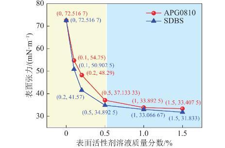 相同質(zhì)量分?jǐn)?shù)下,SDBS溶液表面張力普遍比APG0810溶液低。在表面活性劑溶液質(zhì)量分?jǐn)?shù)為0.01%、0.02%、0.05%時,SDBS分別較APG0810溶液低7.03%、13.92%、6.03%。這是由于APG0810為非離子表面活性劑,在水中不電離出離子,SDBS為陰離子表面活性劑,在水中電離出陰離子,同種電荷間斥力在宏觀上表現(xiàn)出表面張力低的現(xiàn)象。