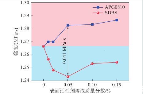 在質(zhì)量分?jǐn)?shù)為0.05%時兩種表面活性劑溶液黏度相差0.041 MPa·s,達(dá)到最大值,這是由于在該質(zhì)量分?jǐn)?shù)下SDBS溶液未形成膠束,且離子之間斥力最大,而APG0810溶液開始形成膠束,溶液內(nèi)分子間碰撞概率變大。