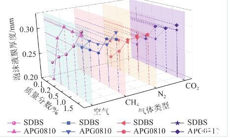 對比相同質(zhì)量分?jǐn)?shù)下不同氣體注入時表面活性劑泡沫液膜厚度進(jìn)行分析。注入空氣情況下,溶液質(zhì)量分?jǐn)?shù)0.15%時,APG0810溶液在泡沫液膜最大,約為0.315 mm,注入甲烷泡沫液膜厚度比空氣低0.006 mm,SDBS溶液泡沫液膜厚度為0.297 mm,注入甲烷泡沫液膜厚度比空氣低0.004 mm,這是由于甲烷氣體密度低于空氣,擴散速率比空氣快。APG0810和SDBS溶液在二氧化碳注入時比空氣分別低0.002 mm和0.004 mm。這是由于二氧化碳?xì)怏w為酸性氣體,離子型表面活性劑溶液在酸性環(huán)境不易形成泡沫液膜結(jié)構(gòu),非離子表面活性劑溶液則不易受酸堿度干擾。